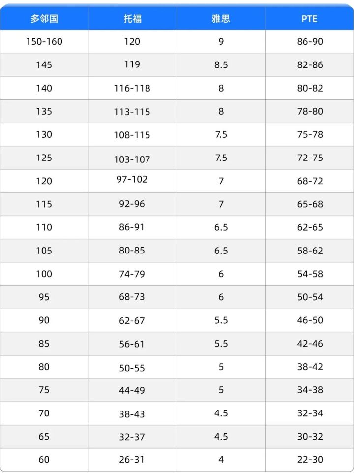 最后在了解这四项考试的区别以后,给大家附上语言成绩转换对照表,供大家参考。