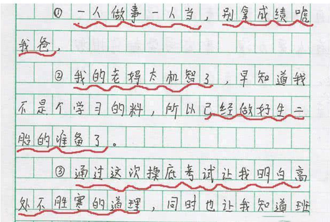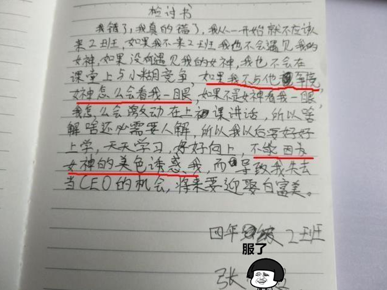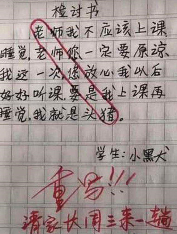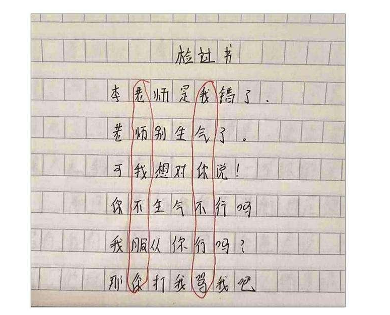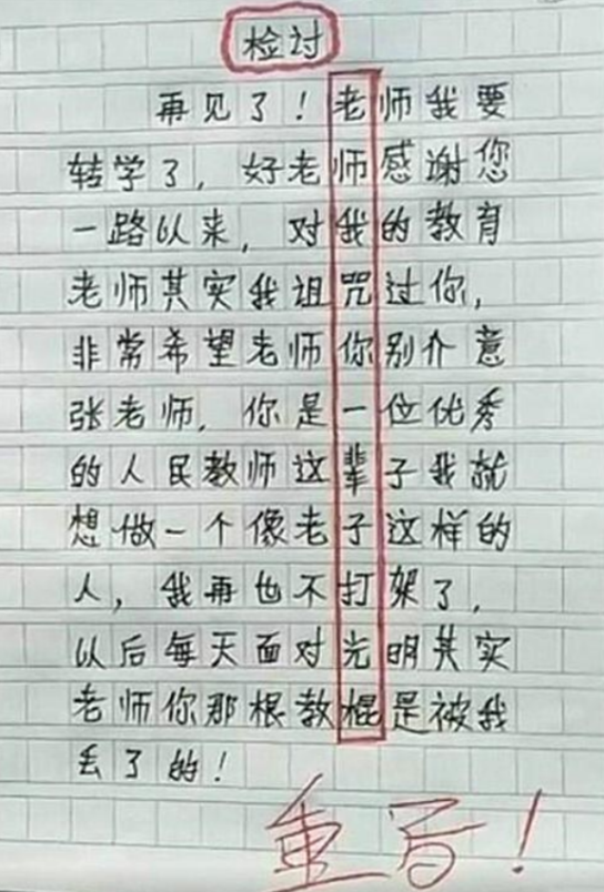 虽然表面上很“认可”老师的这样的惩罚方式,却会在“检讨书”中暗藏玄机,表达对老师的不满和不服气。逐字逐句看似在反省,却逃不过老师的法眼。
