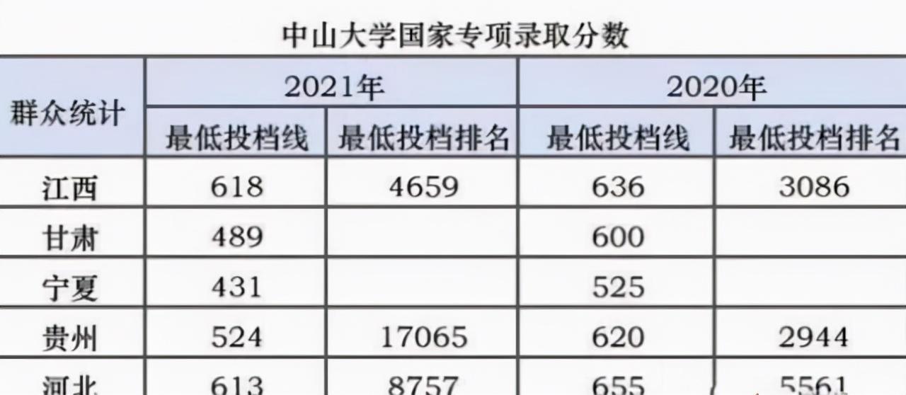 根据中山大学国家专项录取分数来看,在2021年在江西的最低投档线为618分,甘肃为489分,宁夏为432分,贵州为524分,河北为613分,分数相比去年来看都有所降低,由此也确实可以看出,即便是作为名校护理专业却依然是无人问津。
