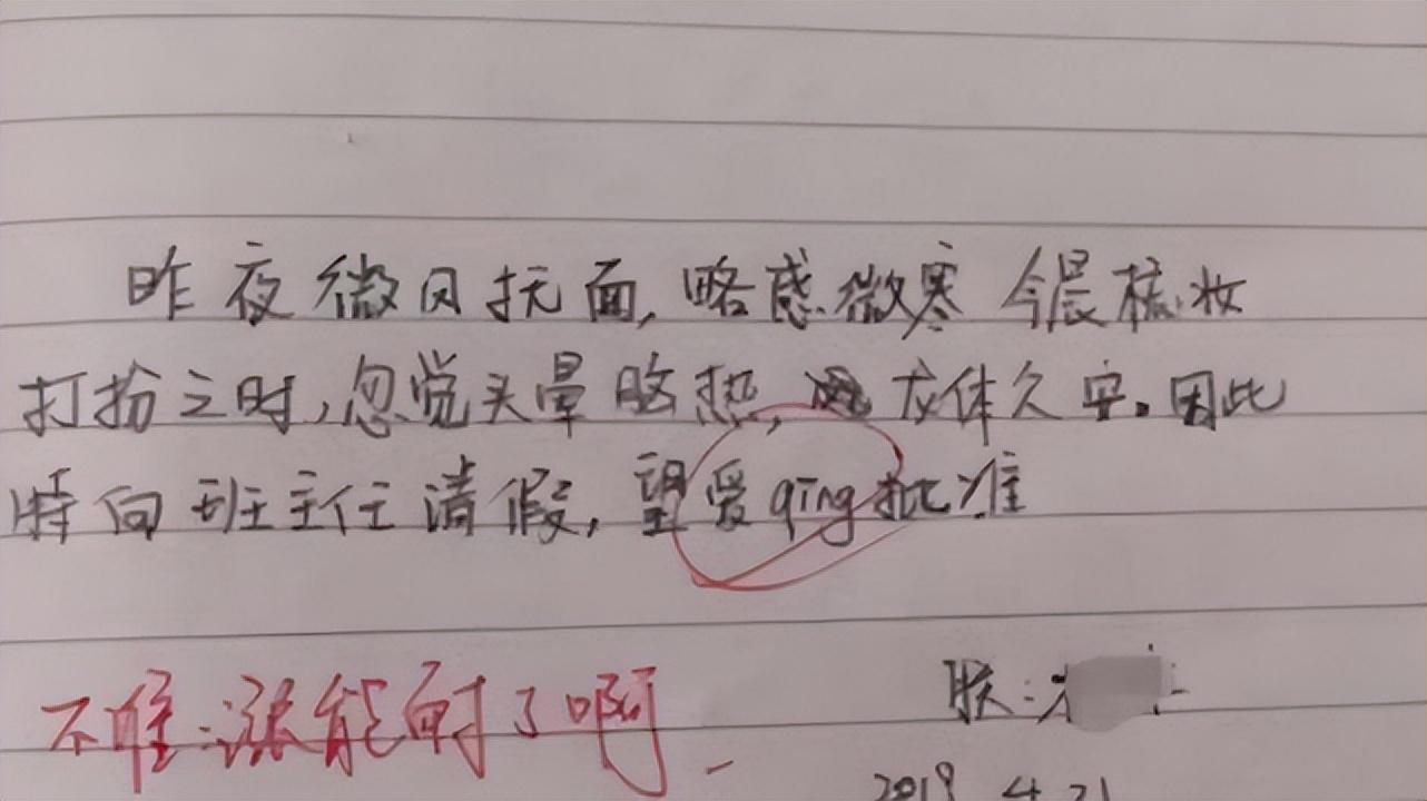 另外虽然文言文请假条很令人惊艳,但是请假的时候还是要尽量言简意赅,不要长篇大论,老师每天的事情很多,没有时间仔细看,而且老师也不喜欢麻烦的事情。