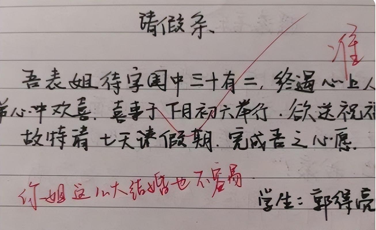 家里有亲人结婚是一件大喜的事情,作为弟弟妹妹是一定会参加的,这位初中生是这样给老师请假的。