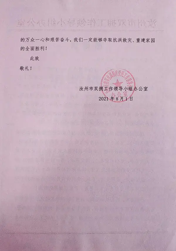 “家园有灾爱无疆,洪水无情人有情!”2021年8月5日,河南省汝州市双拥工作领导小组办公室向大江南北的10余座军营发出感谢信,感谢汝州籍12名官兵在家乡遭受洪涝灾害时,慷慨解囊献爱心的善行义举。