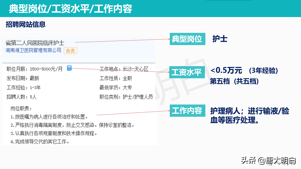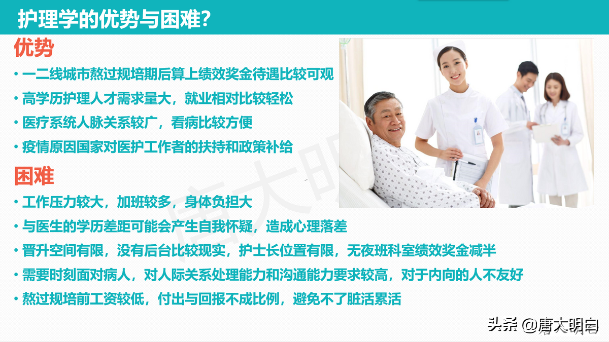 具体如下图,优势主要是规培期后待遇较好,高学历护理人才需求量大,就业相对比较轻松等;劣势主要是工作压力较大,不同科室可能存在夜班加班,可能面临脏活累活等。