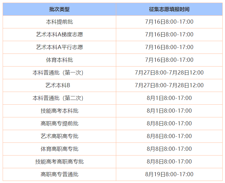 第一次网上集中填报志愿时间为:6月29日8:00至7月2日17:00,实行分段截止,其中:本科提前批志愿填报的截止时间为6月30日17:00;高职高专提前批、本科普通批、艺术本专科批、体育本专科批、技能高考本专科批志愿填报的截止时间为7月2日17:00。