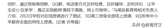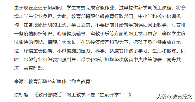 教育部就在近日发布通知强调:在各地原计划的正式开学日之前,不要提前开始新学期课程网上教学……在防控疫情严峻形势下,把孩子身心健康放在第一位,珍惜宝贵假期,不过度施加压力,科学、适度安排孩子学习、生活和锻炼。