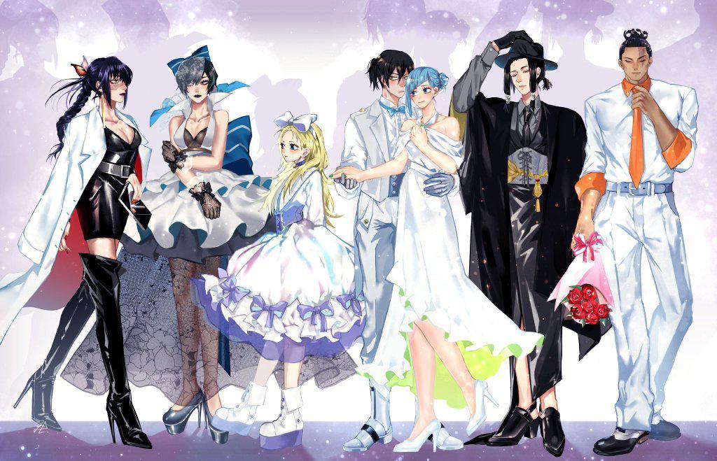 我们按照顺序从左到右说一下,首先登场的是歌姬。歌姬在作品中经常穿的衣服是女巫服,在Party上她摇身一变,穿着紧身的连衣裙和过膝长靴,感觉御姐味十足,不知道她会不会在派对上和五条悟又吵起来呢?