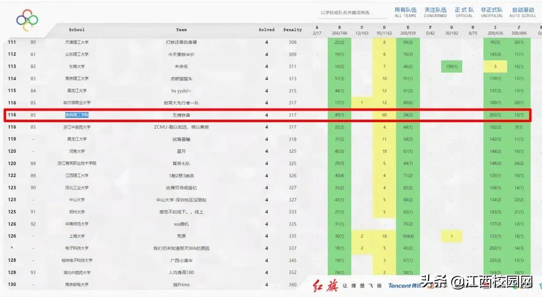 2021年11月27-28日,中国大学生程序设计竞赛(CCPC)哈尔滨站正式赛在哈尔滨工程大学举办,南昌理工学院应邀参赛,队员们积极备赛、奋力拼搏,最终南昌理工学院代表队获得铜牌,位列第85位,全国民办本科高校第1名,江西省高校(含公办)第2名!在此之前,南昌理工学院代表队分别在江西省省赛、河北省省赛、四川省省赛等区域省赛夺得金银铜牌若干枚。