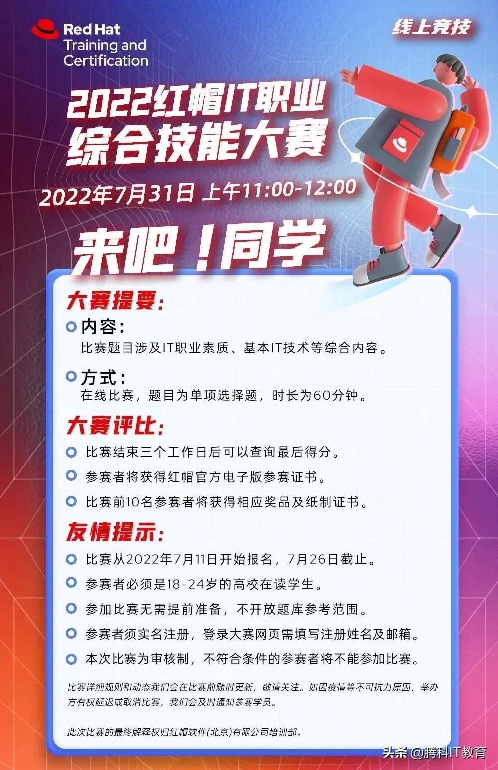 红帽和红帽院校授权合作伙伴一起举办的2022红帽IT职业综合技能大赛报名已经开启!报名时间截止到7月26日,还没有报名的学生抓紧了!