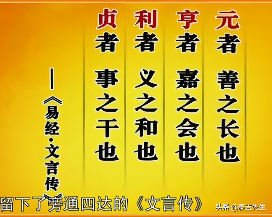 “元、亨、利、贞”在这种情境之下是君子四德之意。孔子把乾卦卦辞阐述为君子四德。《易经-文言传》曰:“元”者,善之长也;(元是一切善的首位,各种善的开始)“亨”者,嘉之会也;(亨是众美之会,是美好的聚集,美好的会和)“利”者,义之和也;(利是讲究义利的结果,均衡适宜的和合,公平公正和谐之意)“贞”者,事之干也。(贞是处事的中正挺拔,是各种行为的根本,中正的操守)