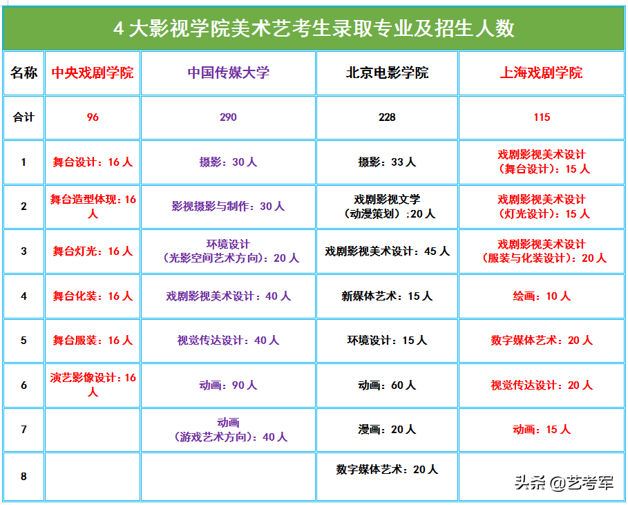 (1)北京电影学院招生艺术总数545名,美术艺考生录取228名,超过招生总额的4成多;
