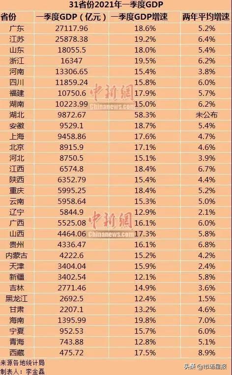 目前,31省份2021年一季度GDP数据全部出炉。增速均为两位数,湖北以58.3%的增速排第一;8个省份GDP增速跑赢了全国GDP增速;两年平均增速方面,西藏排名第一。广东一季度GDP总量超过2.7万亿元,排名第一;安徽一季度GDP赶超上海,挤进全国十强。具体如下图: