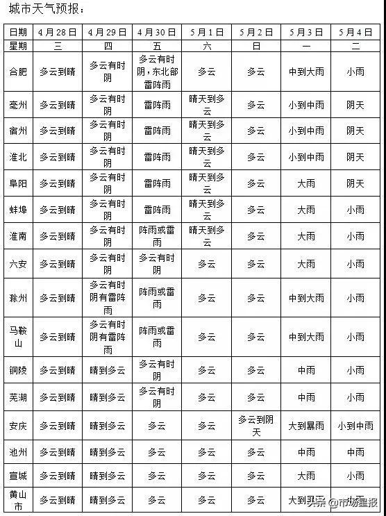 据安徽省气象台预报,今天沿江江北中东部部分地区有阵雨或雷雨,同时西南风平均风力4~5级,阵风8级;30日沿淮淮北大部分地区和淮河以南中东部部分地区有阵雨或雷雨,局部地区有短时强降水、雷暴大风或冰雹等强对流天气。受冷暖空气共同影响,5月3日起我省将有一次降水过程,其中3日沿淮淮河以南部分地区有大雨到暴雨,4日沿江江南部分地区有中到大雨。