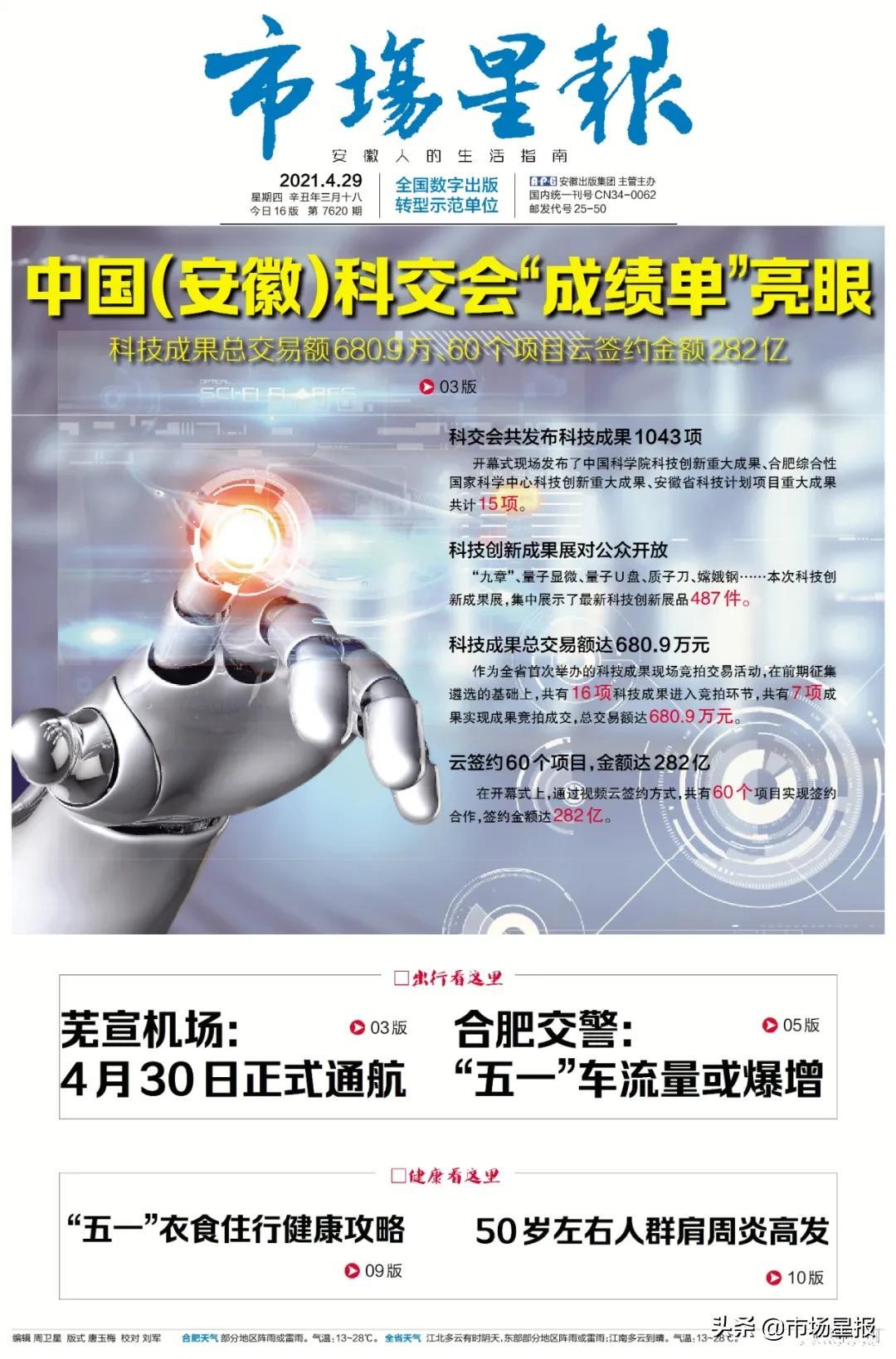 4月28日,记者从2021中国(安徽)科交会成果新闻发布会上获悉,4月26至27日,由安徽省人民政府、科技部、中国科学院联合主办的2021中国(安徽)科交会在安徽创新馆成功举行,共发布科技成果1043项,科技创新成果展集中展示了487件成果,在开幕式上,通过视频云签约方式,共有60个项目实现签约合作,签约金额达282亿元,“426线上交易节”直播销售1.4亿元,交出了一份亮丽的“成绩单”。