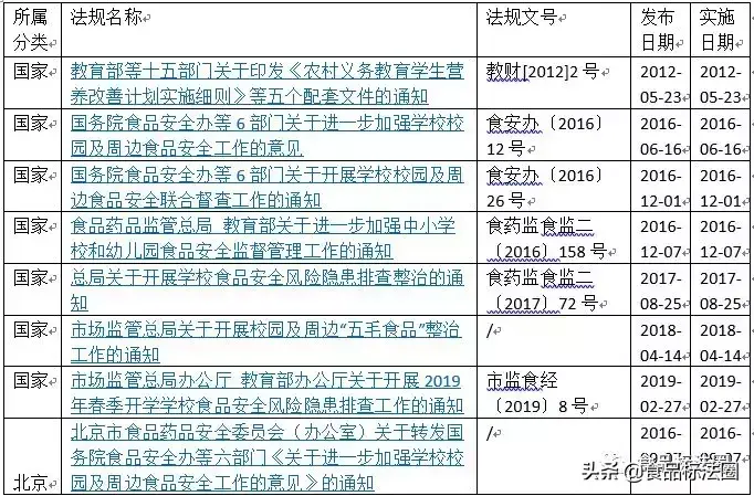 近期,成都七中实验学校小学部食堂向学生售卖过期发霉食品事件,引起了社会各界的高度重视,其实,国家及地方为保障学生的食品安全,针对各地校园食堂、供餐单位及周边五毛食品等都发布了相关文件,2019年2月27日市场监管总局办公厅及教育部办公厅联合发布了《关于开展2019年春季开学学校食品安全风险隐患排查工作的通知》(市监食经〔2019〕8号),防范食物中毒等食品安全事件发生,以保障广大师生身心健康。下面,食品伙伴网为大家详细介绍下国家及地方层面近些年发布的有关学校食品安全的法规文件。关于农村义务教育学生食品安全