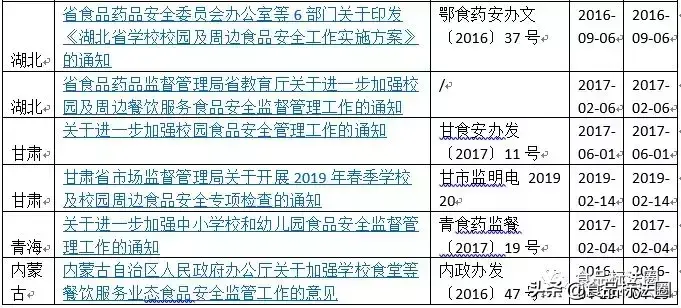 2016年9月6日,湖北省食药监发布省食品药品安全委员会办公室等6部门关于印发《湖北省学校校园及周边食品安全工作实施方案》的通知,对进一步规范和加强学校(含托幼机构)校园及周边食品安全工作,提高学校校园及周边食品安全水平的总体要求以及工作任务等进行了详细要求。