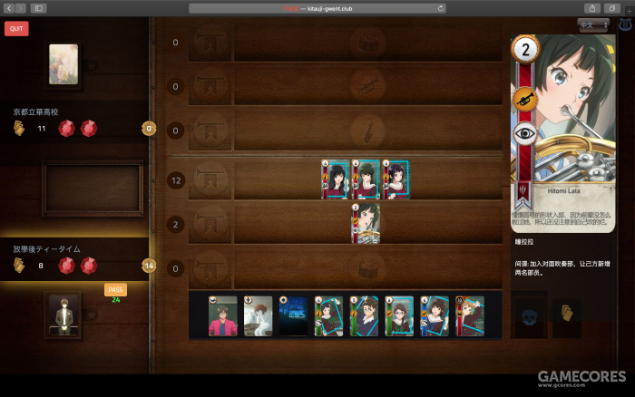 《打响吧!昆特牌:欢迎来到北宇治棋牌社》完全基于昆特牌开发,基本规则与昆特牌保持相同。玩家在游戏中将扮演乐队经理人的角色,为吹奏部寻觅合适的乐队指挥,带领吹奏部的成员分别在京都府大赛,关西大赛,和全国大赛中与全日本各地的吹奏强校对战。想要从京都府大赛突围,甚至说想要晋级全国大赛挑战全国金奖,那就至少要在前一级别的比赛中取得代表资格(仅仅是金奖还不够)。