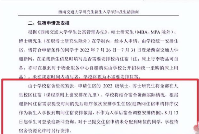 今年成功上岸的西南交通大学硕士研究生和博士研究生的学子们,在被录取后拿到的新生入学手册上才第一次明确得知:宿舍资源不够,若是在提交住宿申请的迎新网上抢不到有限的床位,则需要在学校外围自行租房,无形之中学费又增加了一万多元。