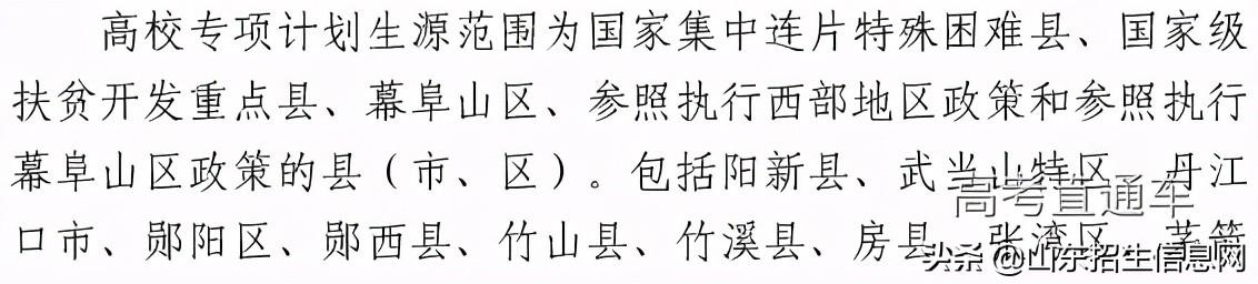 2020年“高校专项计划”招生实施区域:济南市商河县、莱芜区(原莱城区)淄博市沂源县枣庄市山亭区烟台市莱阳市、栖霞市、长岛县潍坊市安丘市、临朐县济宁市泗水县、鱼台县、金乡县、嘉祥县、汶上县、梁山县泰安市宁阳县、东平县、岱岳区、新泰市聊城市东昌府区、茌平区、临清市、阳谷县、莘县、东阿县、冠县、高唐县日照市莒县、五莲县德州市德城区、陵城区、平原县、夏津县、武城县、乐陵市、临邑县、宁津县、庆云县、齐河县、禹城市临沂市兰山区、罗庄区、河东区、郯城县、兰陵县、莒南县、沂水县、蒙阴县、平邑县、费县、沂南县、临沭县滨州市惠民县、阳信县菏泽市牡丹区、定陶区、曹县、成武县、单县、巨野县、郓城县、鄄城县、东明县