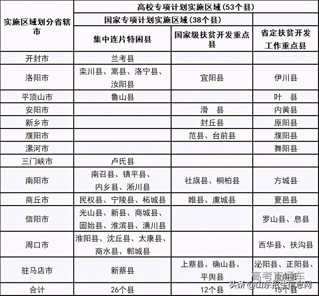 内蒙古2021年高考国家专项计划、高校专项计划、地方专项计划实施区域已经确定,意向农村专项计划招生的考生,需在高考报名时进行预报名。高校专项计划实施区域为:土默特左旗、托克托县、和林格尔县、清水河县、武川县、石拐区、白云鄂博矿区、土默特右旗、固阳县、达尔罕茂明安联合旗、阿鲁科尔沁旗、巴林左旗、巴林右旗、林西县、克什克腾旗、翁牛特旗、喀喇沁旗、宁城县、敖汉旗、满洲里市、扎兰屯市、牙克石市、根河市、额尔古纳市、阿荣旗、莫力达瓦达斡尔族自治旗、鄂伦春自治旗、鄂温克族自治旗、新巴尔虎右旗、新巴尔虎左旗、陈巴尔虎旗、阿尔山市、科尔沁右翼前旗、科尔沁右翼中旗、扎赉特旗、突泉县、霍林郭勒市、科尔沁左翼中旗、科尔沁左翼后旗、开鲁县、库伦旗、奈曼旗、扎鲁特旗、二连浩特市、阿巴嘎旗、苏尼特左旗、苏尼特右旗、东乌珠穆沁旗(含乌拉盖管理区)、西乌珠穆沁旗、太仆寺旗、镶黄旗、正镶白旗、正蓝旗、多伦县、丰镇市、卓资县、化德县、商都县、兴和县、凉城县、察哈尔右翼前旗、察哈尔右翼中旗、察哈尔右翼后旗、四子王旗、达拉特旗、准格尔旗、鄂托克前旗、鄂托克旗、杭锦旗、乌审旗、伊金霍洛旗、五原县、磴口县、乌拉特前旗、乌拉特中旗、乌拉特后旗、杭锦后旗、阿拉善左旗、阿拉善右旗和额济纳旗。5山西2020年山西专项计划实施区域贫困县名单为:一、集中连片特殊困难地区和国家级扶贫开发重点县(36个)太原市:娄烦县大同市:天镇县、阳高县、广灵县、灵丘县、浑源县、云州区长治市:武乡县、壶关县、平顺县朔州市:右玉县晋中市:左权县、和顺县运城市:平陆县忻州市:神池县、宁武县、五台县、河曲县、静乐县、偏关县、 五寨县、 保德县、 繁峙县、代县、岢岚县临汾市:大宁县、永和县、隰县、汾西县、吉县吕梁市:临县、石楼县、方山县、中阳县、兴县、岚县二、省级贫困县(22个)1.省定贫困县(17个)长治市:沁县、沁源县晋城市:沁水县、陵川县晋中市:榆社县临汾市:古县、安泽县、浮山县、乡宁县、蒲县运城市:万荣县、闻喜县、垣曲县、夏县吕梁市:离石区、柳林县、交口县2.插花贫困县(5个)太原市:阳曲县朔州市:平鲁区、山阴县晋中市:昔阳县吕梁市:交城县6河南2020年河南省实施“国家专项计划”和“高校专项计划”县域名单为: