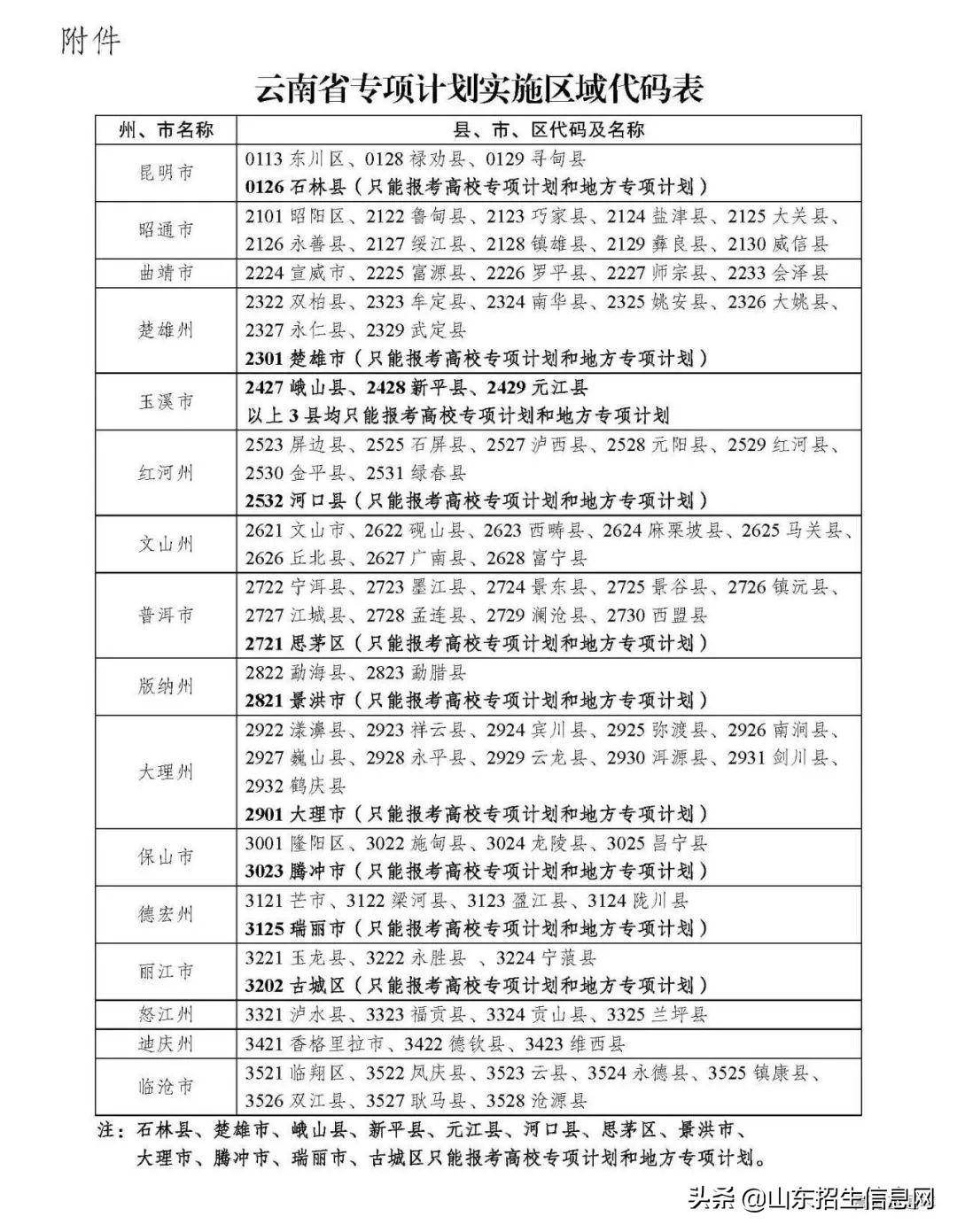 地方专项计划和高校专项计划实施区域为88个贫困县、3个边疆县(河口县、景洪市、瑞丽市)、4个少数民族自治县(石林县、峨山县、新平县、元江县)和5个国家扶贫攻坚县(楚雄市、思茅区、大理市、腾冲县、古城区),共100个县、市、区的农村区域,(包括所有集中连片特殊困难县和国家级扶贫开发重点县,详见附件)。