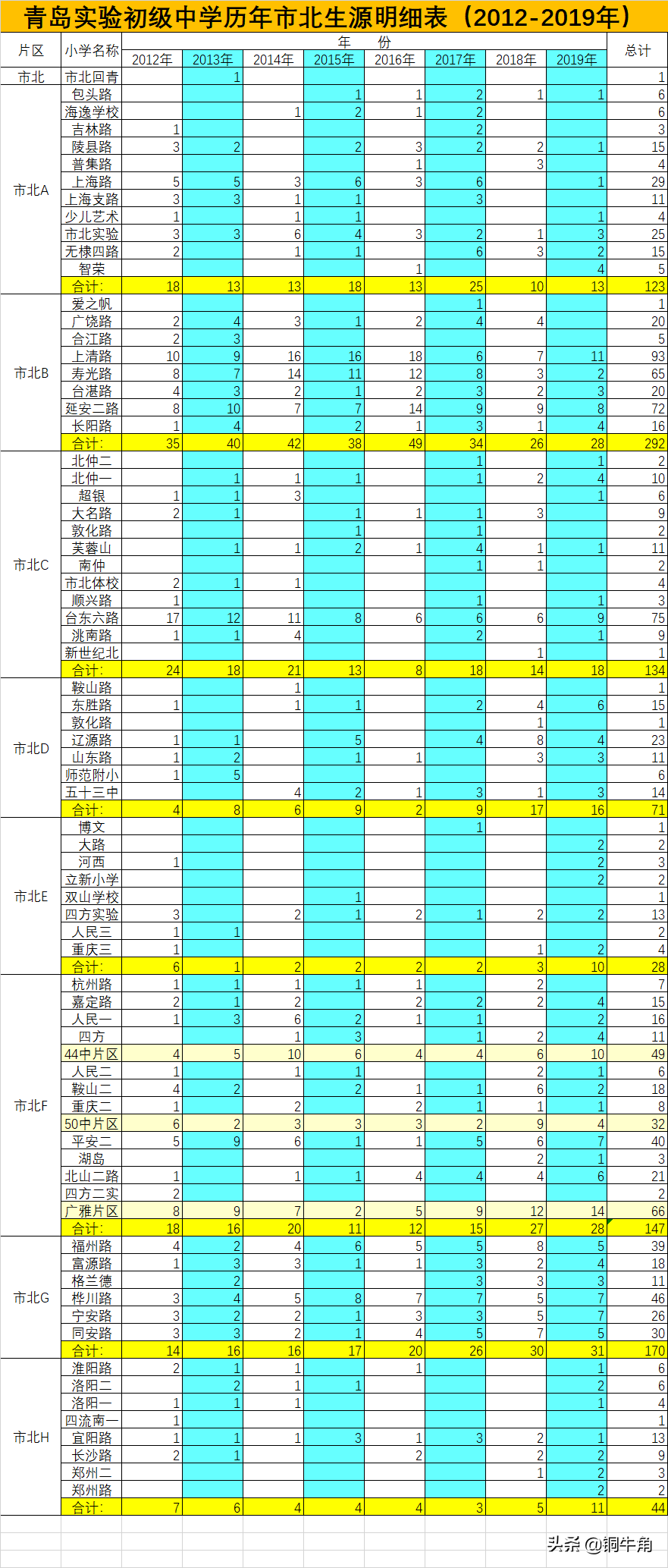 市北H片区各小学的分班情况,我们可以通过《青岛市北H片各小学历年分班数量》这张表格来察看。