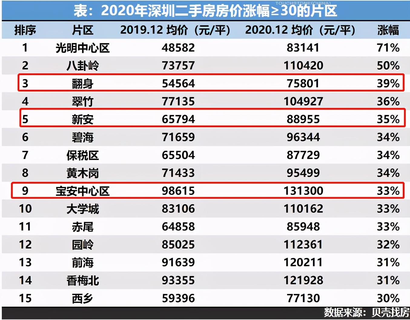 从贝壳统计的2020年深圳二手房房价涨幅情况来看,宝安的翻身、新安、宝安中心区的均价年涨幅都超过了30%,其中翻身片区更是从5字头冲上了7字头,涨幅高达39%,气势如虹。