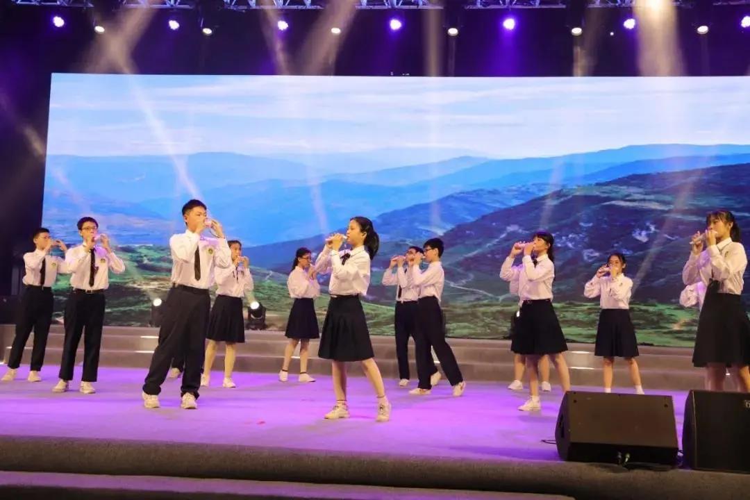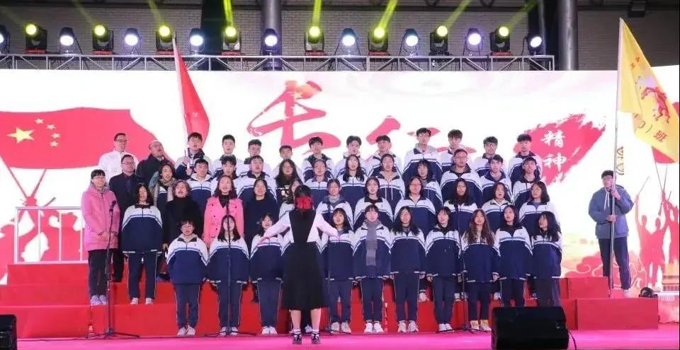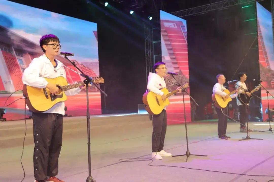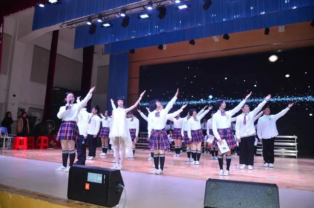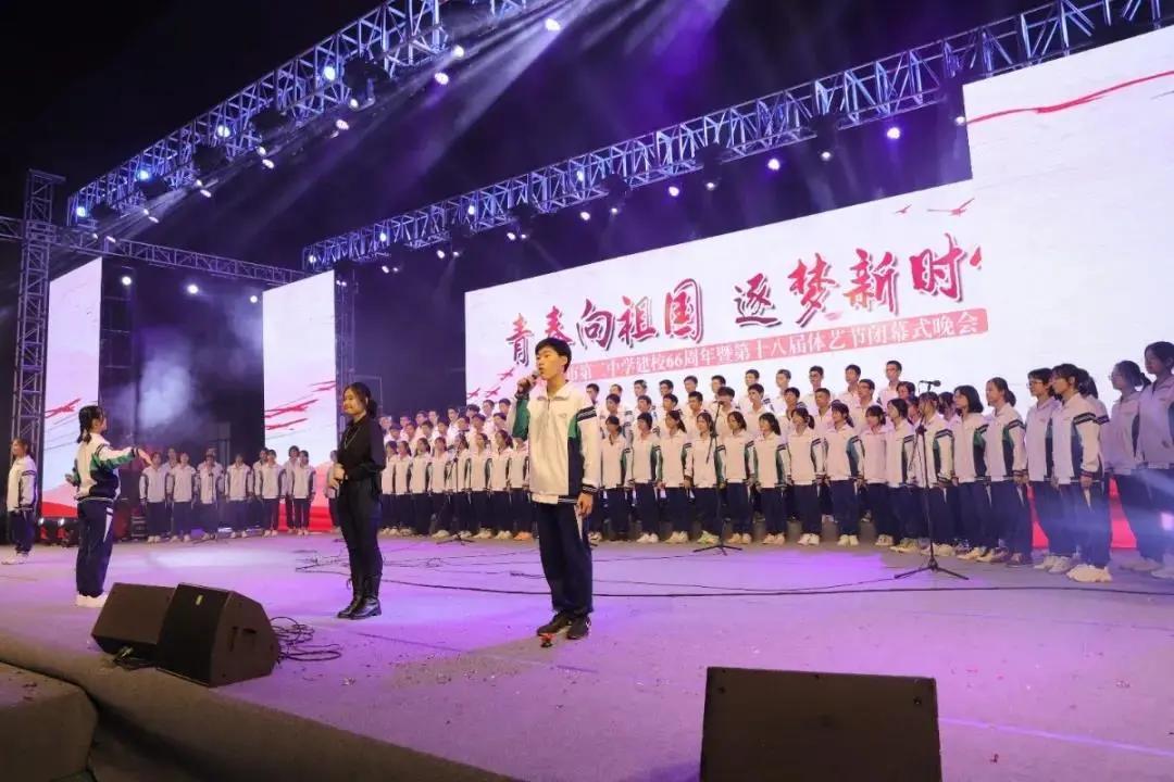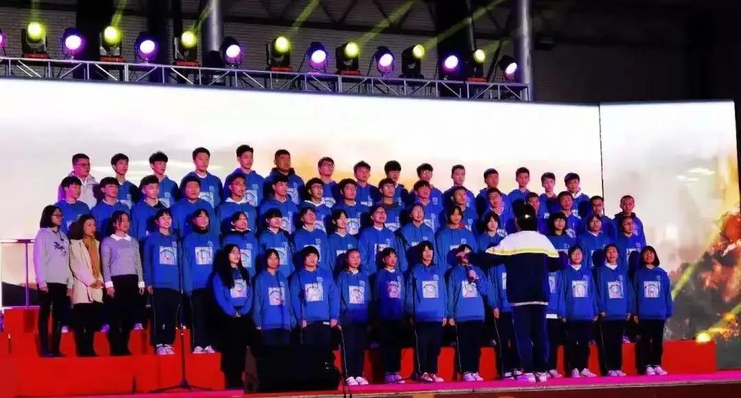 率先上场的是狮高合唱队,一首《红旗飘飘》,一首《爱我中华》将现场气氛点燃。然后是全校30个班级合唱曲目,每个班级均邀请科任教师上台,师生同唱一首歌,展现了狮高师生之间和谐友爱之情。