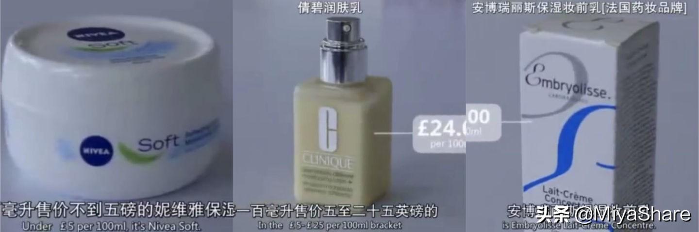 在纪录片中使用的三款产品分别是妮维雅、法国大宝及倩碧黄油作为对比产品。