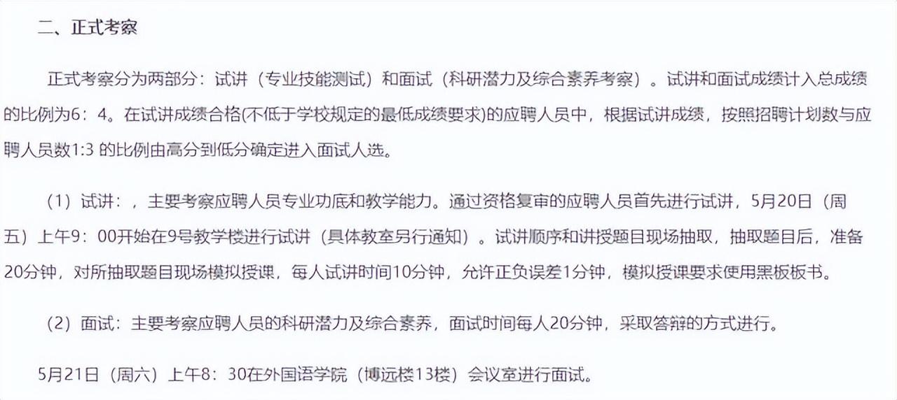 当满足基本条件之后,接下来就需要进行面试。而面试又分为两个部分,一个是试讲,一个是专业问答。最后将两个部分的得分加权计算得出最终得分,而这便是是否入选的依据。