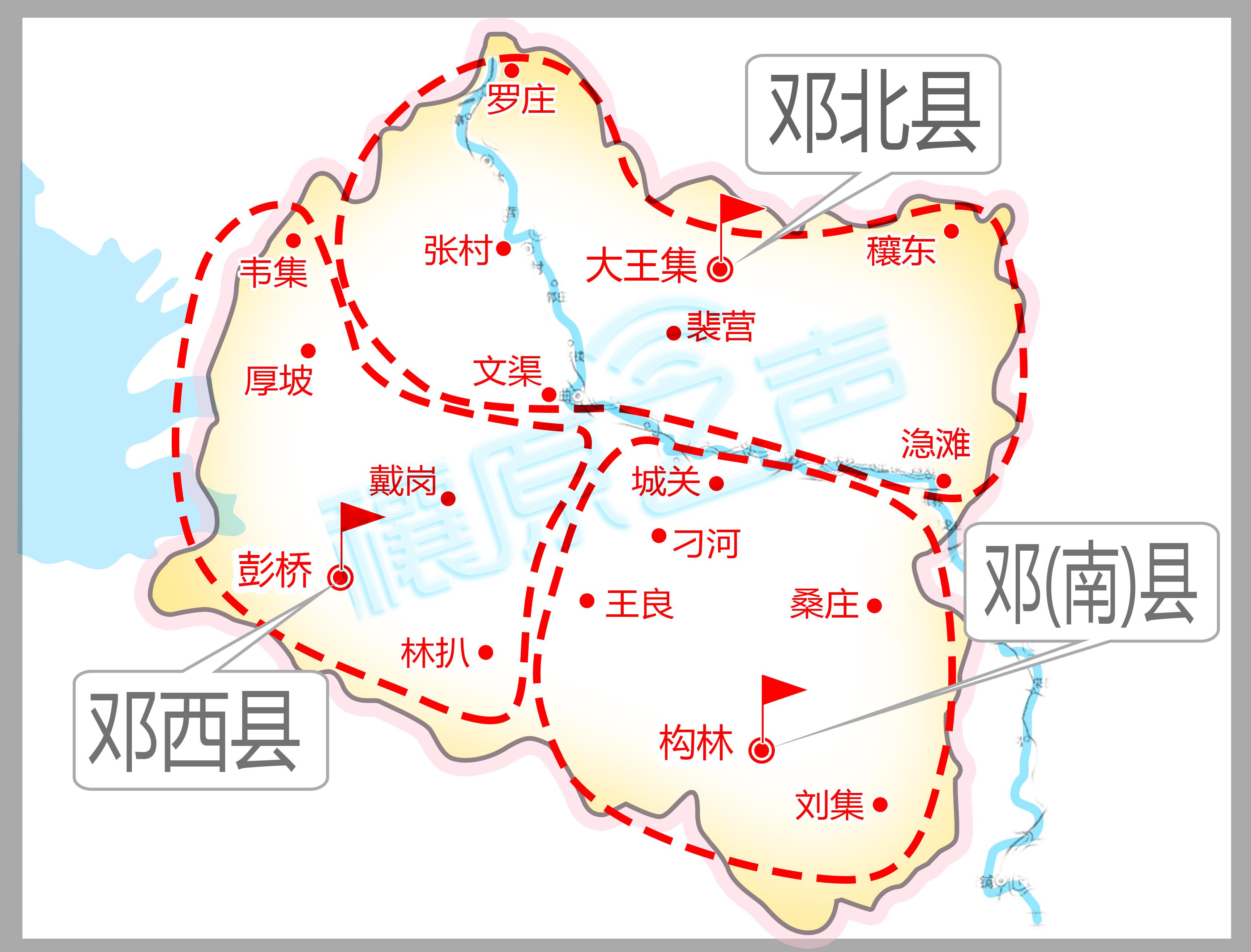 民国38年1949年3月邓县与邓北县合并后,建立邓县。下设区、乡、村三级政权组织。区人民政府设正副区长,并配备秘书、民政、公安、生产、财粮、文教等助理员。区辖乡乡公所设正副乡长、财粮、民兵中队长、妇联主任。乡辖村,村设村长、财粮武装和妇女等干部。区政权为第一区人民政府(驻㴔滩)、第二区人民政府(驻裴营)、第三区人民政府(驻构林)、第四区人民政府(驻刁河店)、第五区人民政府(驻桑庄)、第六区人民政府(驻林扒)、第七区人民政府(驻彭桥)、第八区人民政府(驻文渠)、第九区人民政府(驻厚坡)、第十区人民政府(驻张村)、第十一区人民政府(驻穰东)、第十二区人民政府(驻城关)。