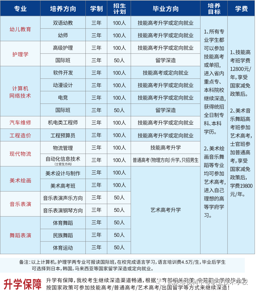 学校采用“以升学为导向培养高素质技能型人才”的管理模式,实现高考班专科升学率100%,本科升学率40%的教学目标:目前学校就业网络遍布全国,就业班实现全员签约就业,在校期间学校将提供创业指导,进校即开展职业生涯规划培养,毕业后对接创业所需资源为每一个毕业生未来发展保驾护航!