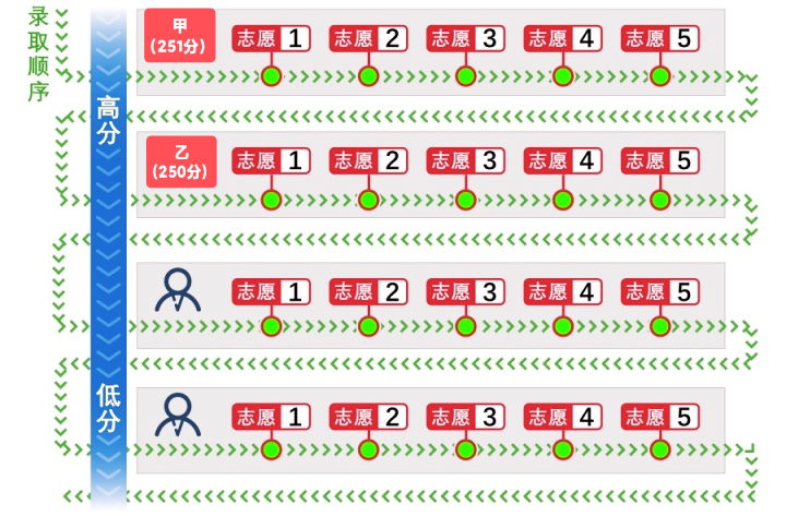 ②低分考生的5个志愿录取顺序永远低于高分考生的5个志愿。