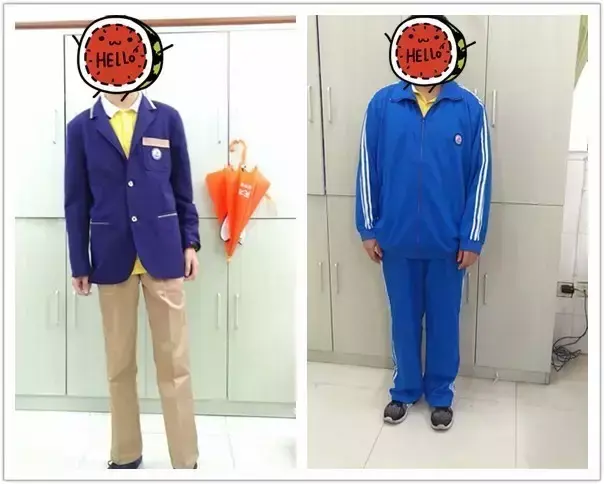 原谅小编给两位模特打了马赛克,毕竟我们是来品鉴校服的,而不是来看小鲜肉的,左边各种酷炫自带修身效果,就是这卡其色的执念有点重,而右边的运动服呢,满满的我国特色,都不知道用什么词形容好了。