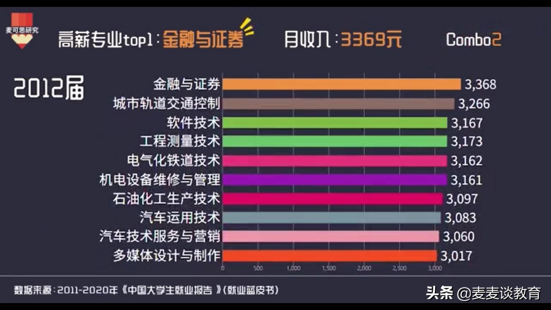 最高:金融证券专业,月收入3368元/月;其次为城市轨道交通控制专业,3266元/月;第十为多媒体设计与制作,3017元/月;
