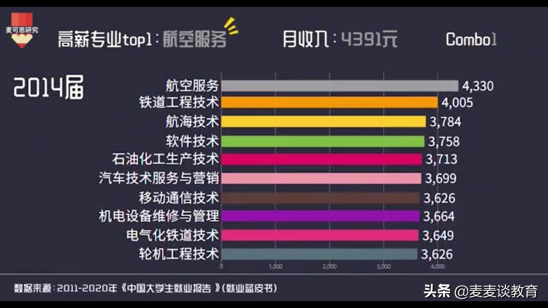 最高:航空服务,月收入4330元/月;其次为铁道工程技术专业,4005元/月;第十为轮机工程技术,3626元/月;