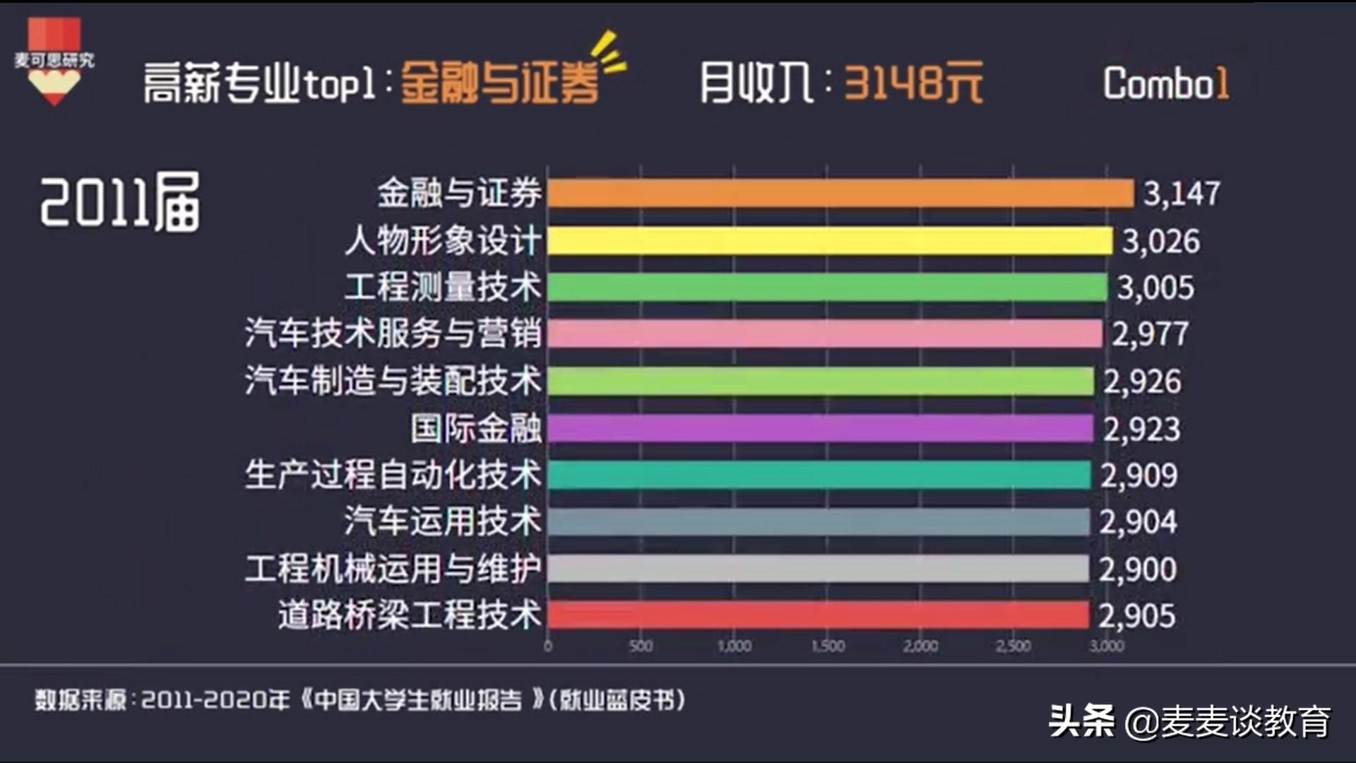 最高:金融证券专业,月收入3147元/月;其次为人物形象设计专业,3026元/月;第十为道路桥梁工程技术,2905元/月;