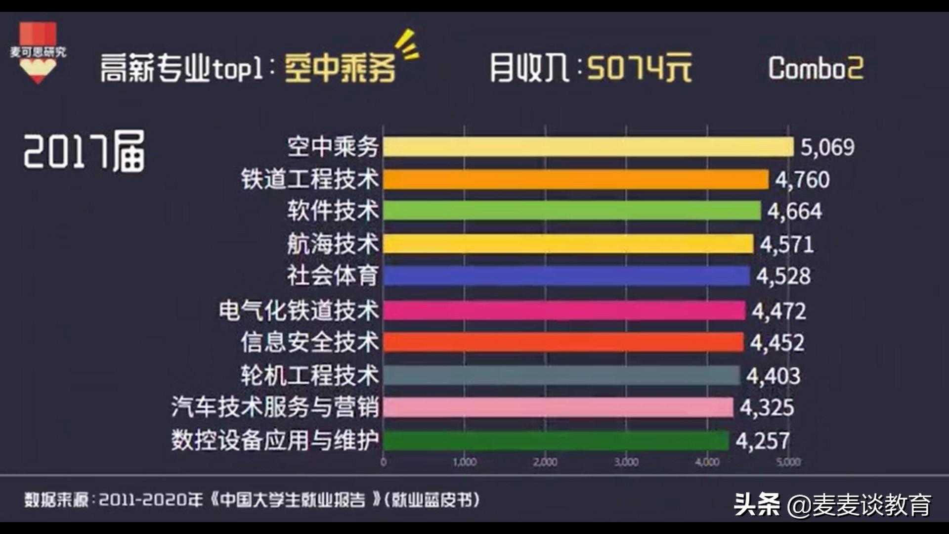 最高:空中乘务,月收入5069元/月;其次为铁道工程专业,4760元/月;第十为数控设备应用于维护,4257元/月;