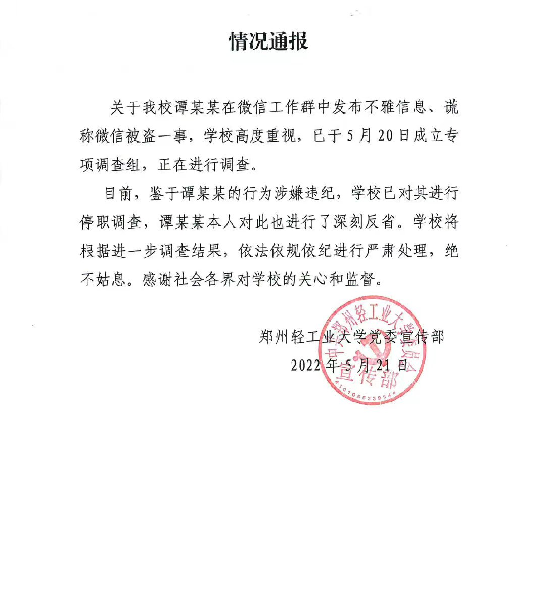 如今学校的回应来了,通报是这样写的:关于我校谭某某在工作群中发布不雅信息,谎称号被盗这件事情,学校高度重视,并已经成立了调查组,目前已对其停职处理。