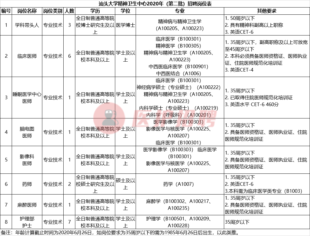 详见附件1《汕头大学精神卫生中心2020年(第二批)招聘岗位表》。