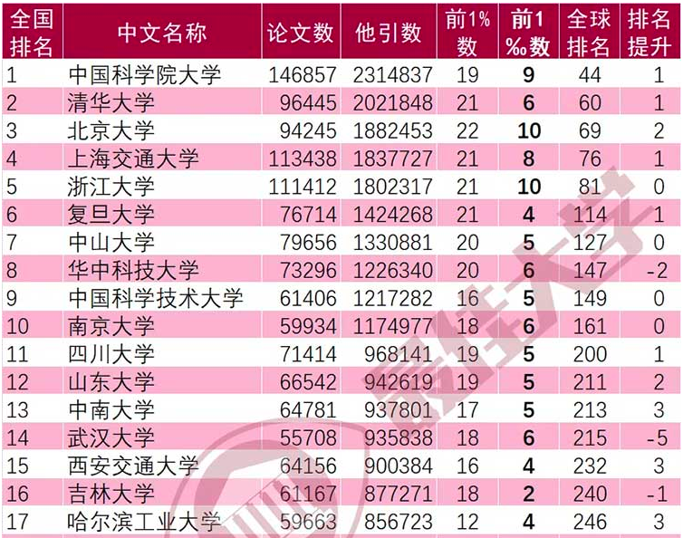 近日,科睿唯安公布了ESI从2011年1月1日到2021年10月31日的统计数据。从全国高校ESI排名情况来看,中国科学院大学论文数为146857,他引数为2314837,前1%学科数19个,前1‰学科数9个,位居中国大陆高校第一,全球排名第44名。清华大学排名提升1名,位居大陆高校第2名,全球第60名,北京大学排名提升2名,位居大陆高校第3名,全球第69名。