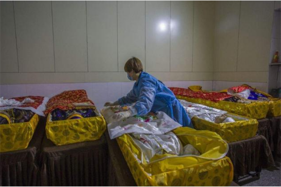 人们在殡仪馆看到入殓师为死者修剪指甲、整理仪容、穿戴衣物。。
