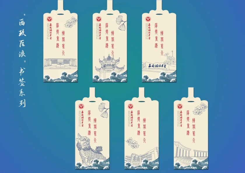 录取通知书封面由图书馆、罗马广场等学校特色建筑为主,背面为银杏下的文津亭,樱花寓意希望,而银杏谐音"迎新"。同时,增加了折扣页,折扣中心是西政校徽,开启折扣,意味着开启知识的新天地;内页左侧为西政校歌,下方是"獬豸"雕像线稿图,象征着学子自强不息的西政精神。除此之外,录取通知书内还附有新生入学手册和精美的"后浪"书签,象征西政"后浪"们厚积薄发。