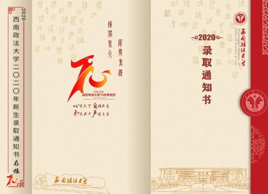 今年,西政的录取通知书由经济法学院2018级本科生潘俊池带领的"后浪团队"结合西政人文,历时3个月完成。全套通知书设计主调淡雅简约,颜色以暖色调为主。2020年在我国纪年中属庚子年在汉字中"庚"意指"金""秋",底色选择了黄色系中典雅的路易米黄色,结合学校特色西政红,录取通知书既充满古韵又充满现代感。