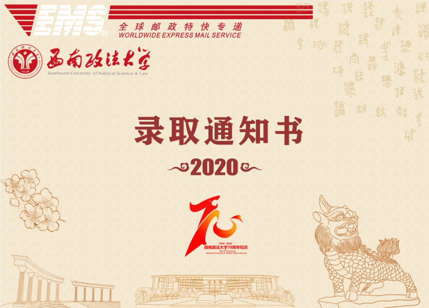 致广大而精微,细节之处见诚意,西政的人文气息从EMS封皮即有体现。EMS封皮选择米黄色基调,配合罗马广场、图书馆、獬豸典型的建筑物,彰显西政学风。正中的"录取通知书"五个大字庄严肃穆,映入眼帘的是西政图书馆线描图,底纹在边角处采用西政"法字墙"和各种书写体"法"字元素,彰显学校政法特色。背面中心处为学校70周年校庆LOGO,配合红色的校训,凸显持久且厚重的办学历史。
