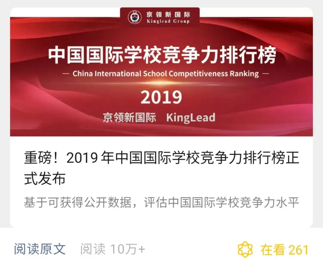 京领发布的“2019中国国际学校竞争力排行榜”发布后微信10小时破10万+,全网总计阅读300万+,获得100+媒体和学校转载。