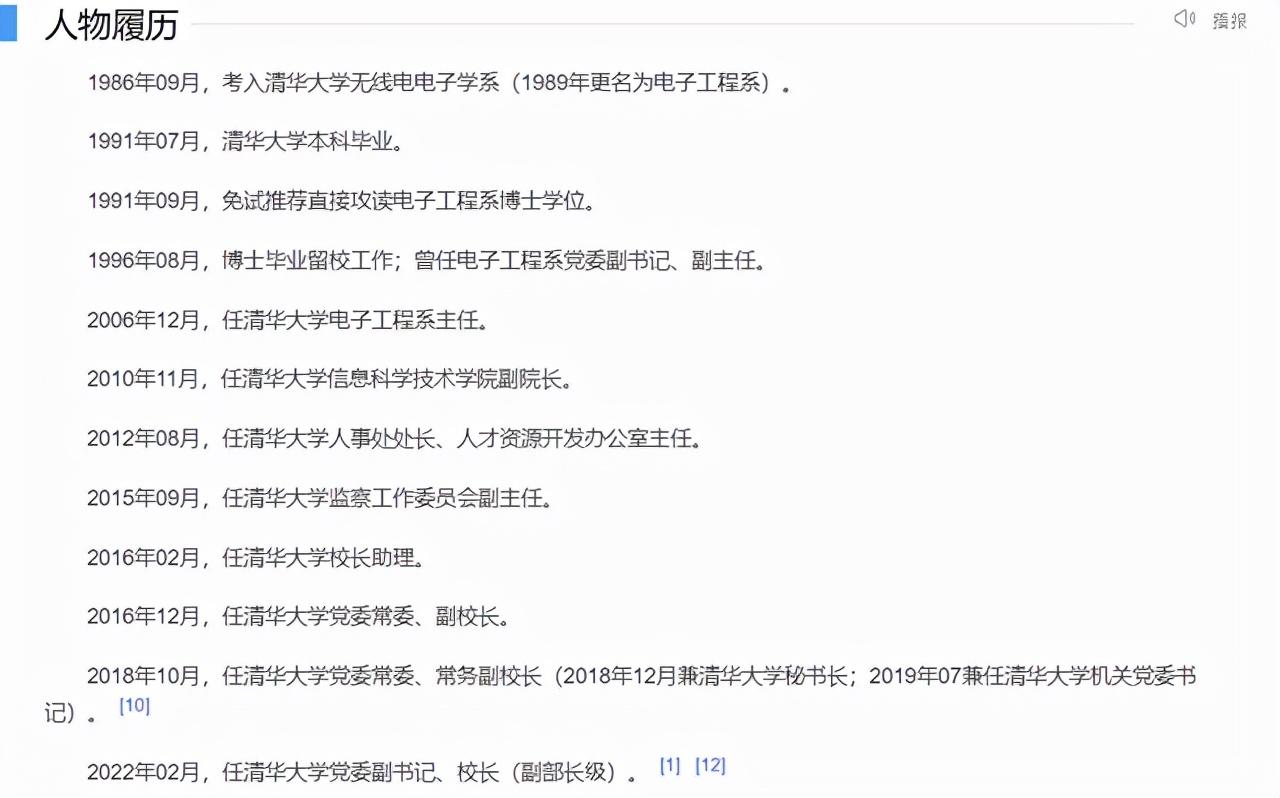 而从职业发展来看,最开始是辅导员,之后通过自己的努力和付出,一步步升职,从系内职务,到院内职务,再到校内职务,最终成长为清华大学党委书记。