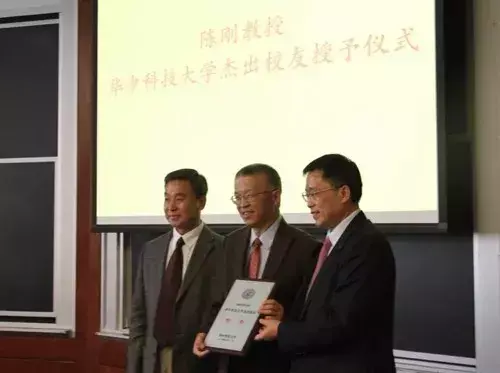 2014年9月,美国工程院院士陈刚颁授“杰出校友”奖牌 图/华中科技大学