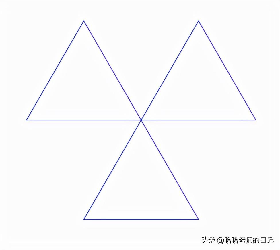 import turtle as tt.speed(0)t.pencolor('blue')for i in range(3):# 画三次 for j in range(3):# 画三角形 t.forward(200) t.left(120) t.left(120)# 画一个图形时,做一定旋转t.hideturtle() t.done()案例3:稍微复杂一些