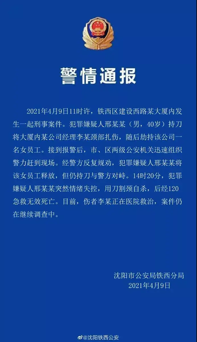 9日,辽宁沈阳铁西区某大厦内发生一起刑事案件。犯罪嫌疑人邢某某(男,40岁)持刀将大厦内某公司经理李某颈部扎伤,随后又劫持该公司一名女员工。经警方反复规劝,邢某某将该女员工释放,但仍持刀与警方对峙。不久后,邢某某突然情绪失控,用刀割颈自杀,后经120急救无效死亡。目前,伤者李某正在医院救治,案件仍在继续调查中。(新华视点)