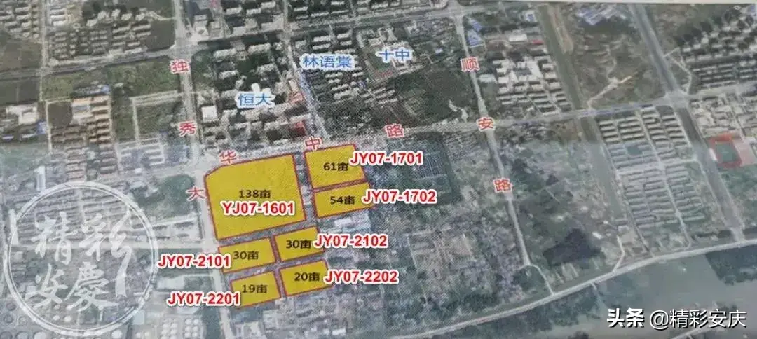 独秀大道与华中东路交叉口东南侧地块为安庆滨江CBD用地,内含7个地块,共计351.81亩。